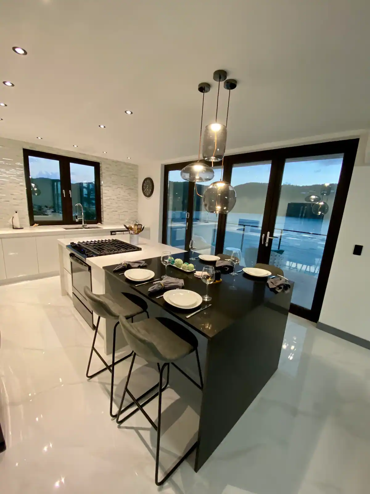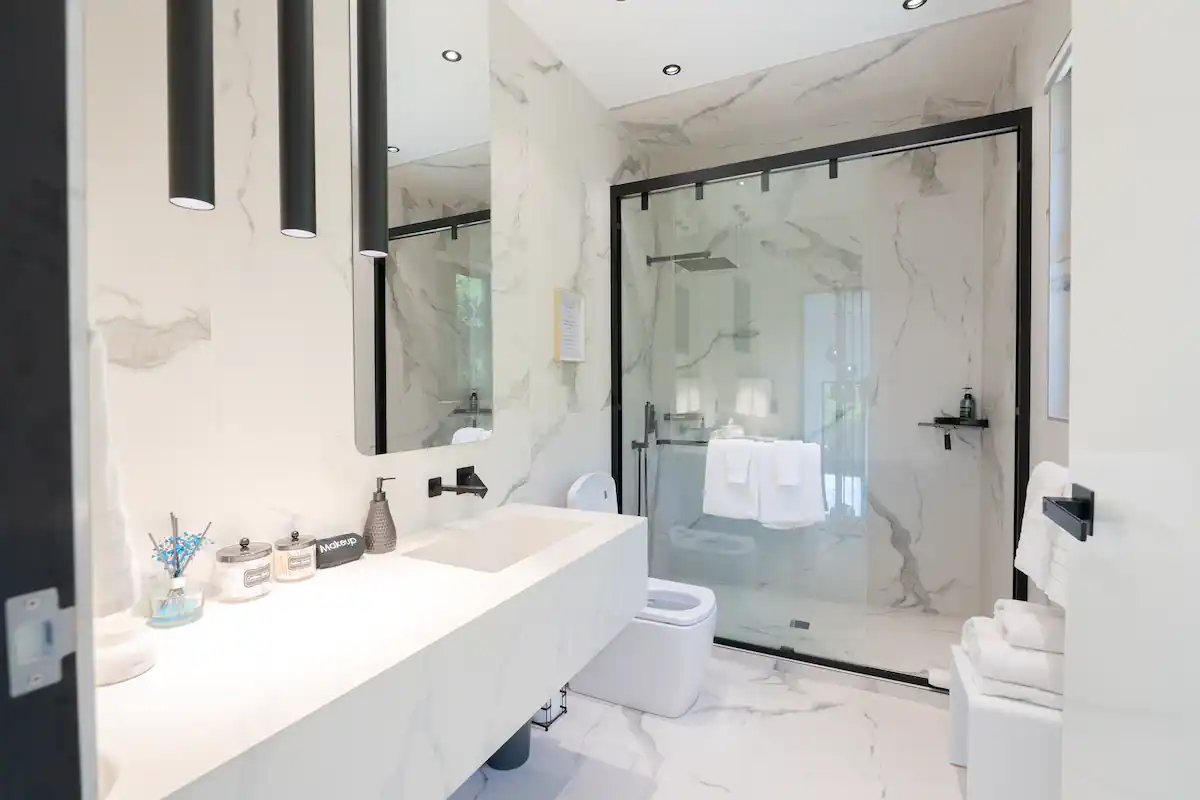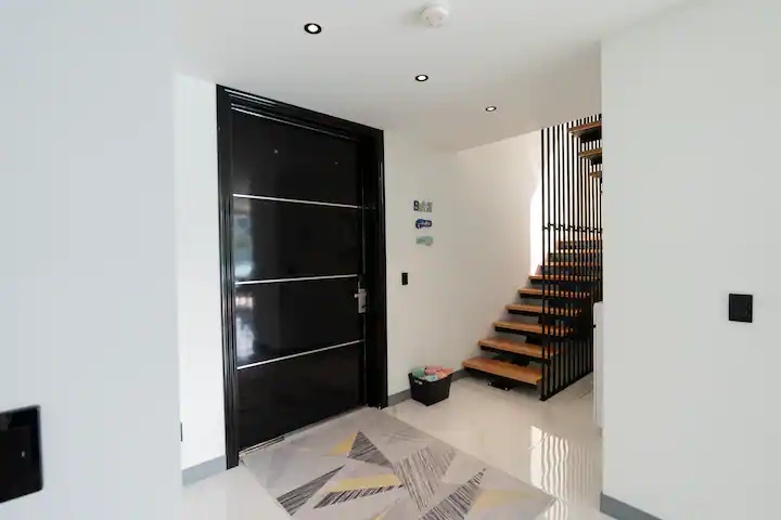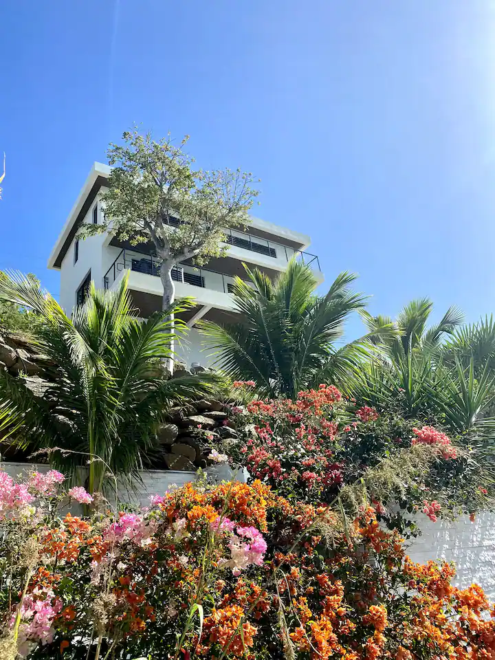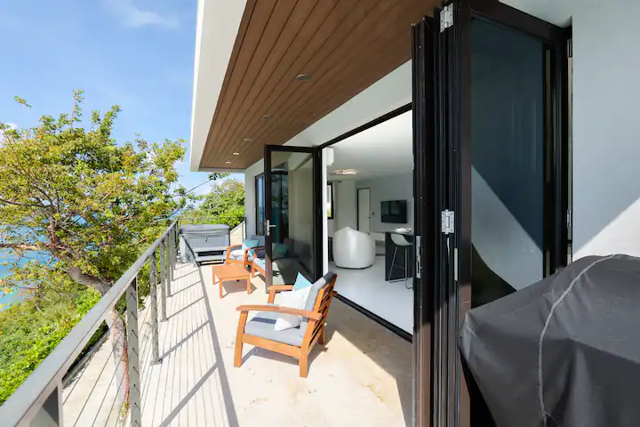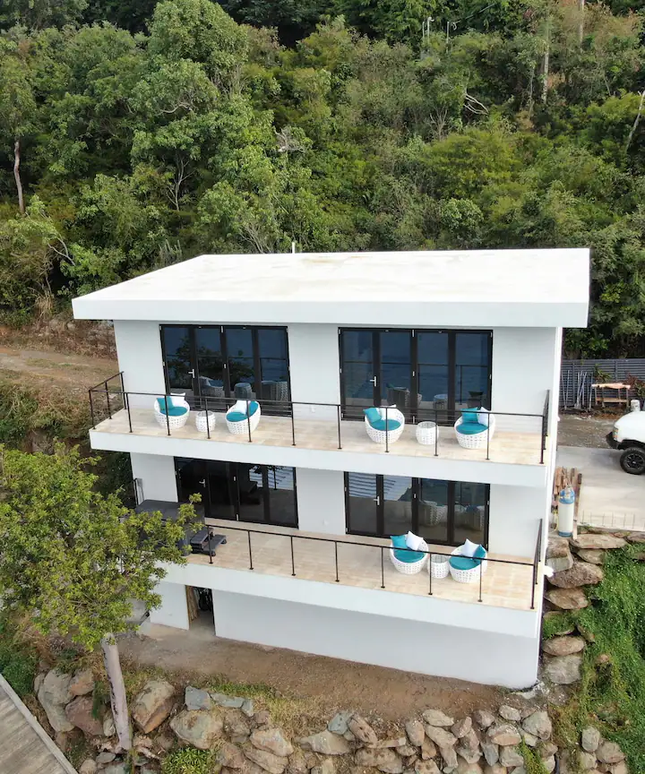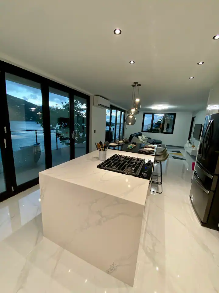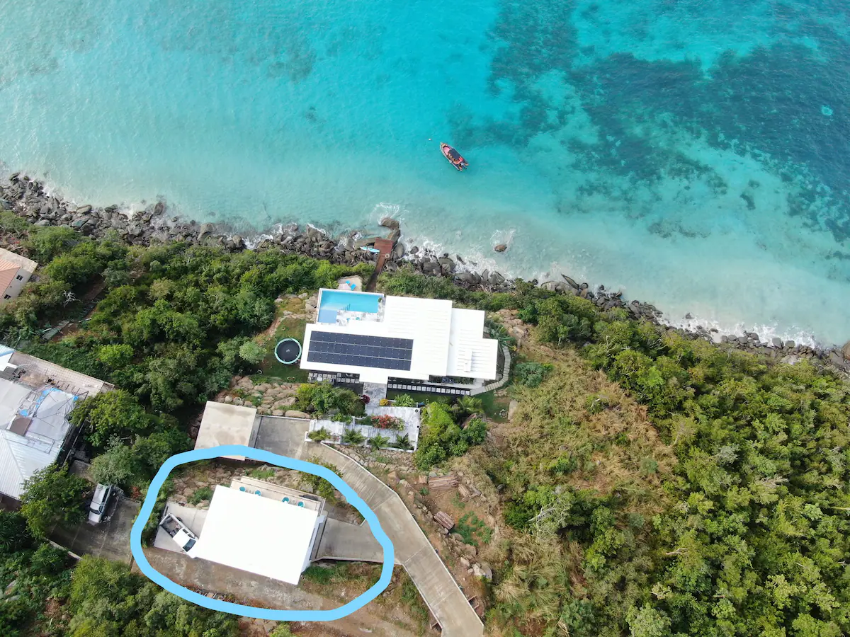 This is brand new villa with all customize finishes offers 2 floors. Main floor area boats kitchen and dining area, living room, powder room and laundry room. Extensive deck provides great area for entertainment, features 3 person hot tub, BBQ grill and sitting area. The upper floor offers 2 bedrooms, where each bedroom has smart TV. The full bathroom offers all of the essentials like shampoo, conditioner, body wash and more. The upper deck offers lounging chairs. Every each bathroom has smart toilet which offers full bidet options and more. The house has 2 parking spots next to the house. The basemeent first floor boats water cisterns and garage. Garage is not accessible to the guests, it is kept as owner’s storage. The villa is mostly off the grid, we collect our own rain water, use solar panels energy and we have our own treatment plant. In case we ran out of the water, water trucks are delivering water for the entire island, so you do not have to worry about the water running out. We are still very cautious of preserving natural resources as energy and water. We are hooked up to the electric company in case we need more energy, but please keep in mind that we live on the island and energy and water is very precious to us, so do not waste the water and do not run AC when you are not home.