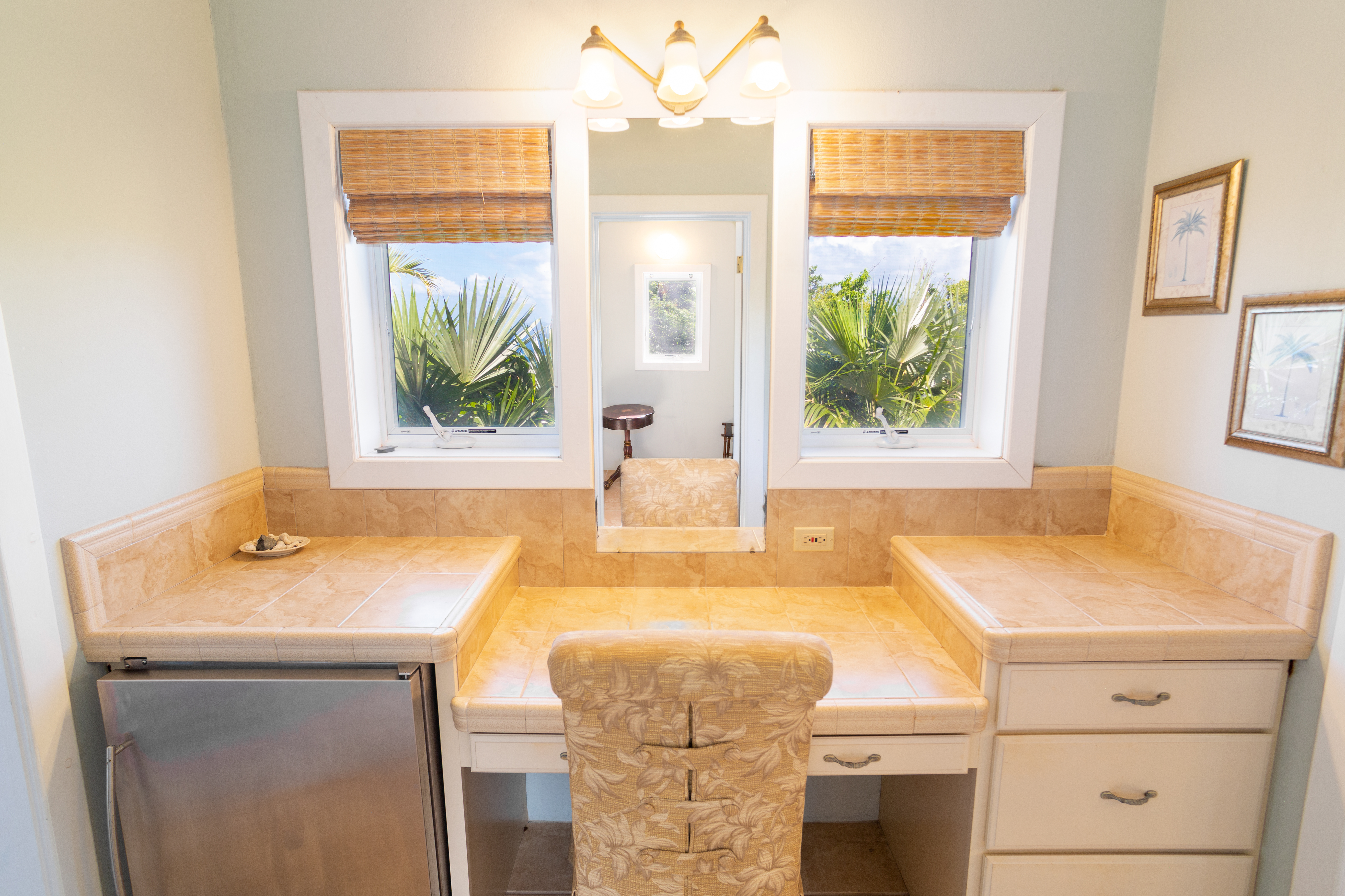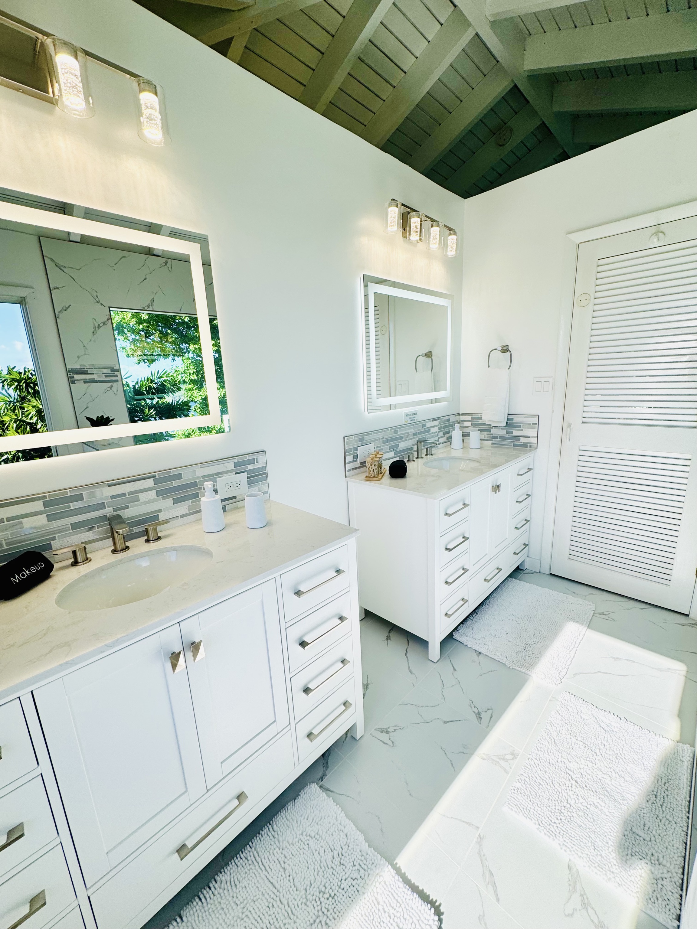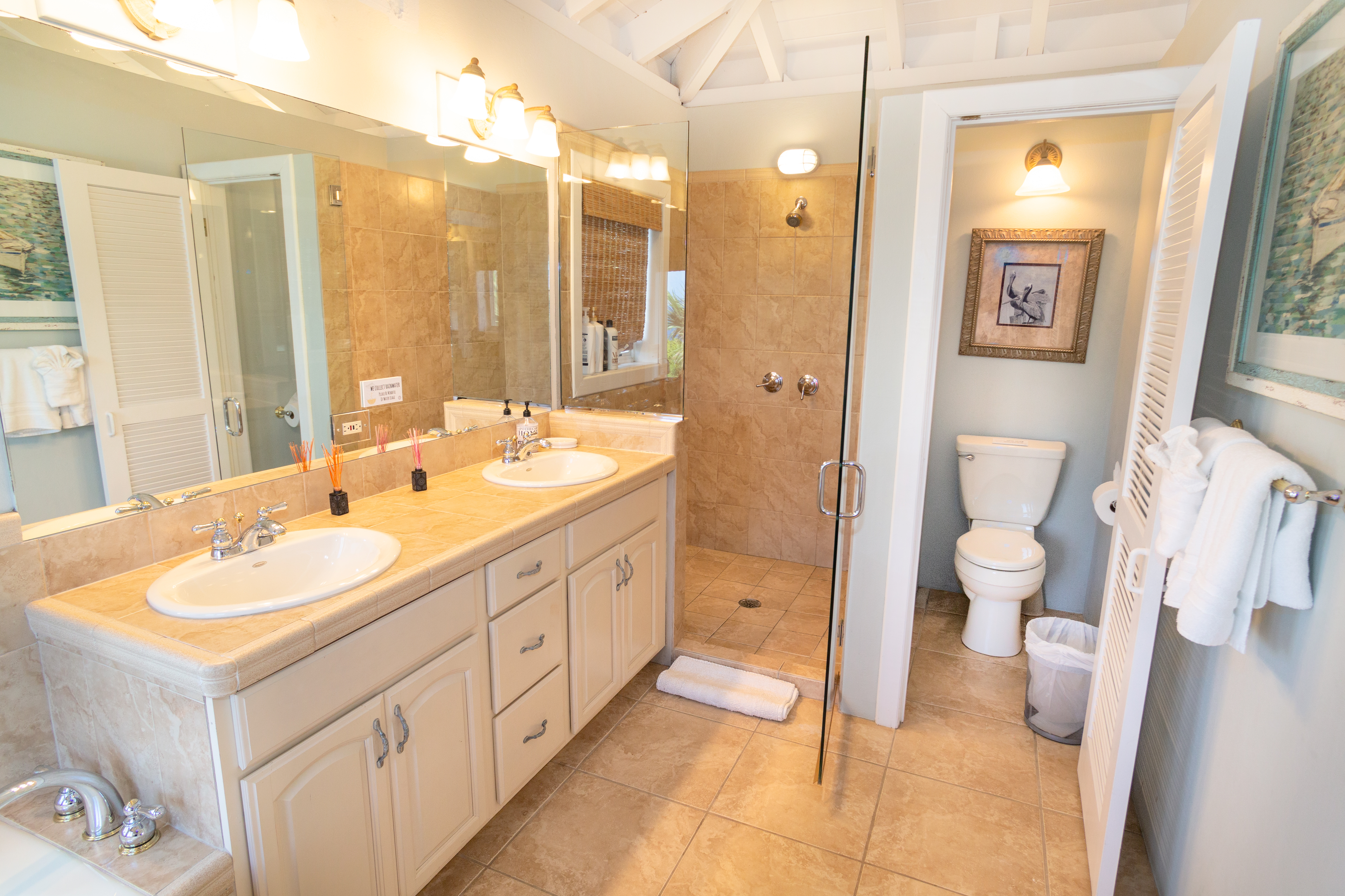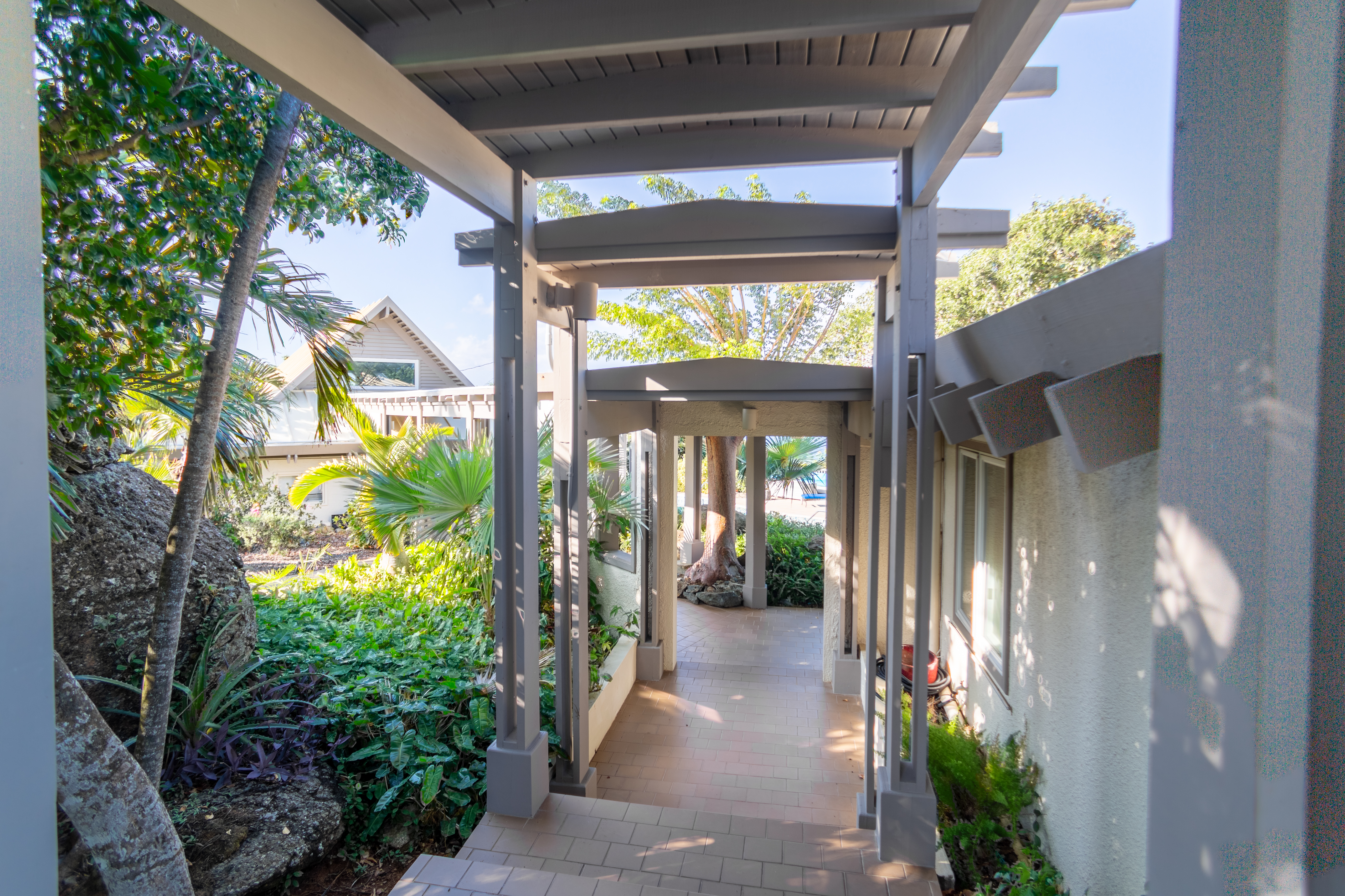 Covered pathways guide you to each villa, which are thoughtfully furnished with air conditioning and attached full bathrooms. The property includes six bedrooms and six and a half bathrooms, along with two fully equipped kitchens. The main villa boasts a newly renovated, state-of-the-art kitchen measuring 40 by 30 feet — ideal for entertaining family and guests alike.