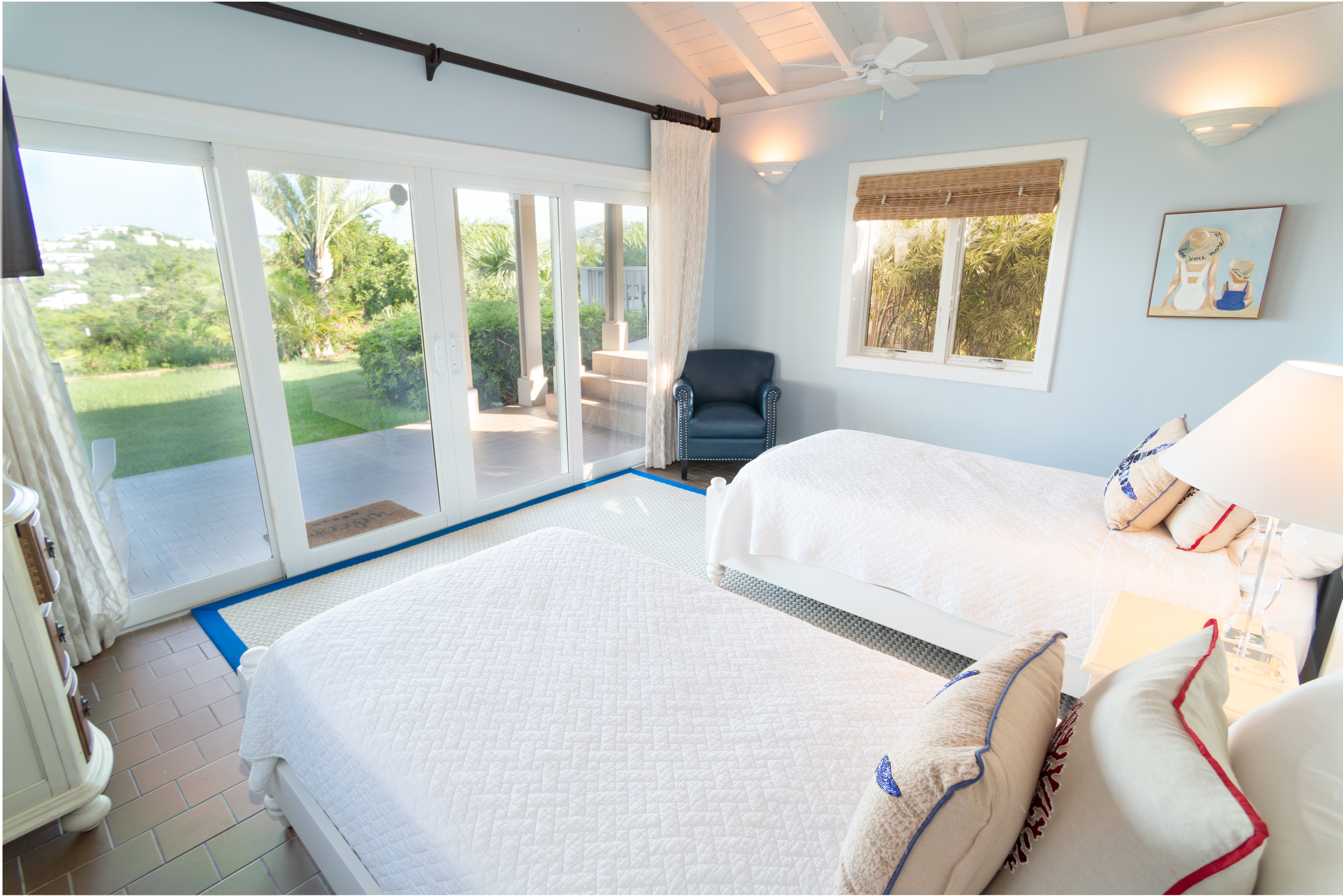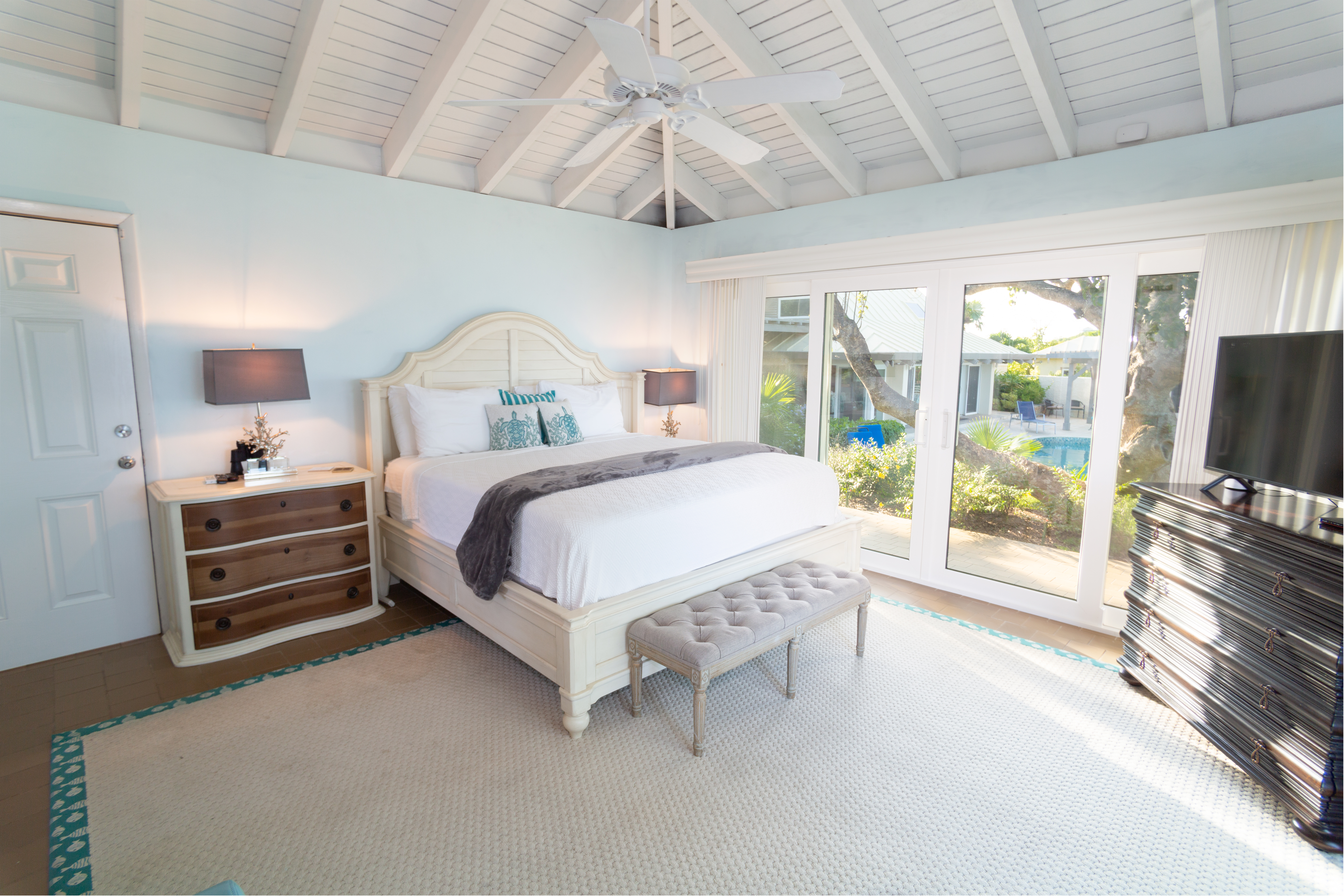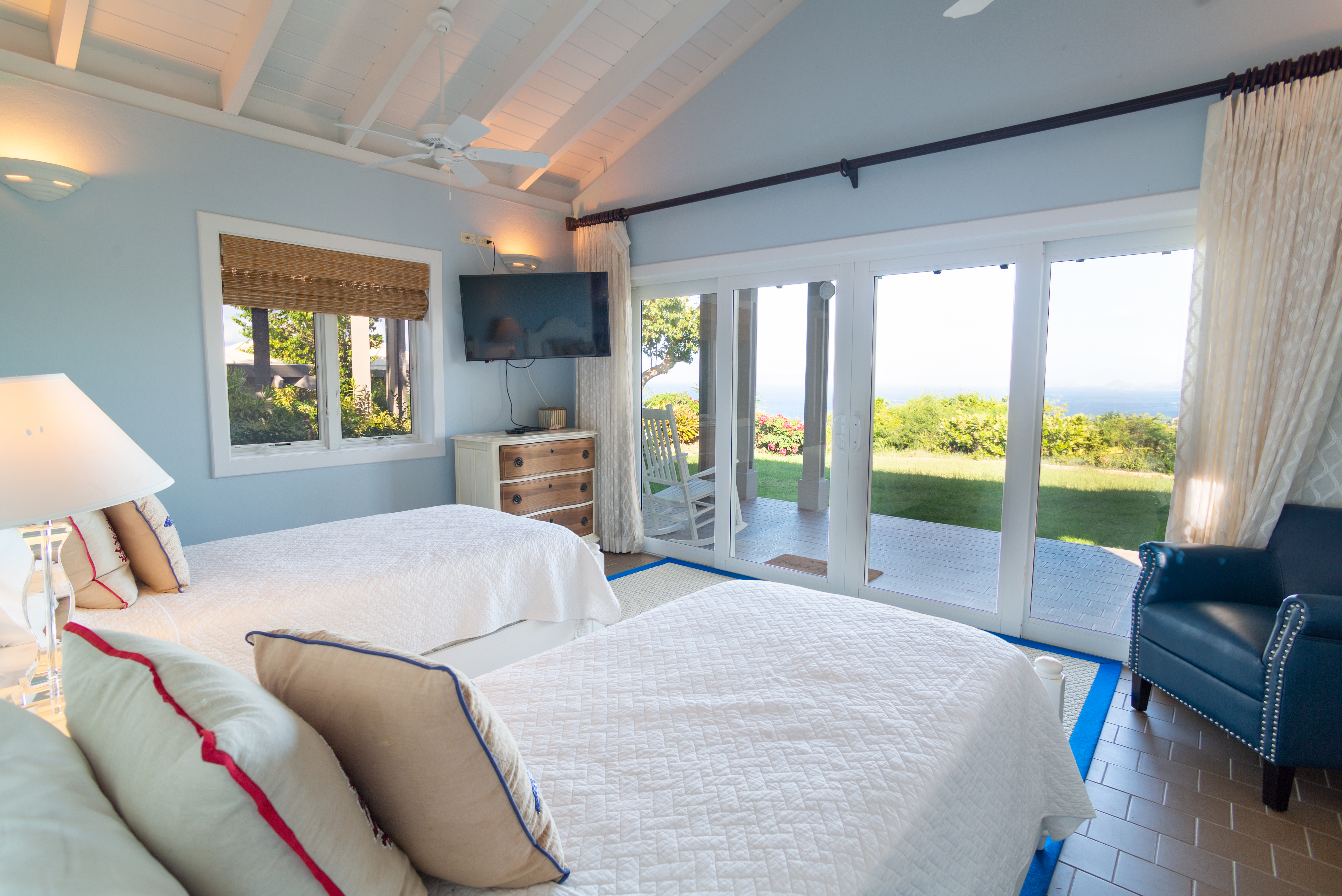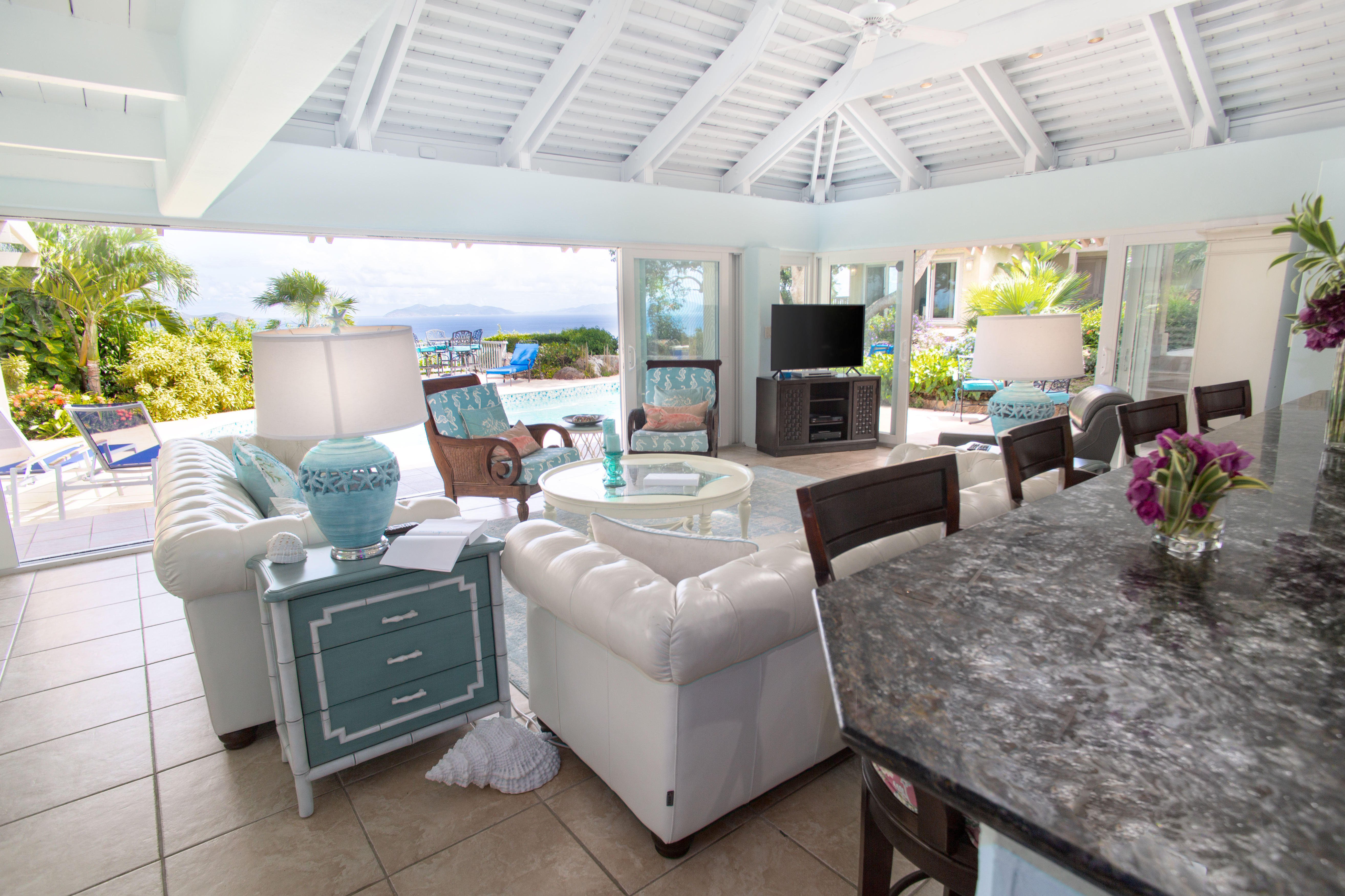 Relax in the spacious, inviting living room while soaking in breathtaking paradise views. The design seamlessly blends indoor and outdoor living, thanks to floor-to-ceiling sliding glass doors on three sides of the villa. Additional conveniences include two separate laundry rooms, WiFi, television, and an option to heat the pool for an extra $550.